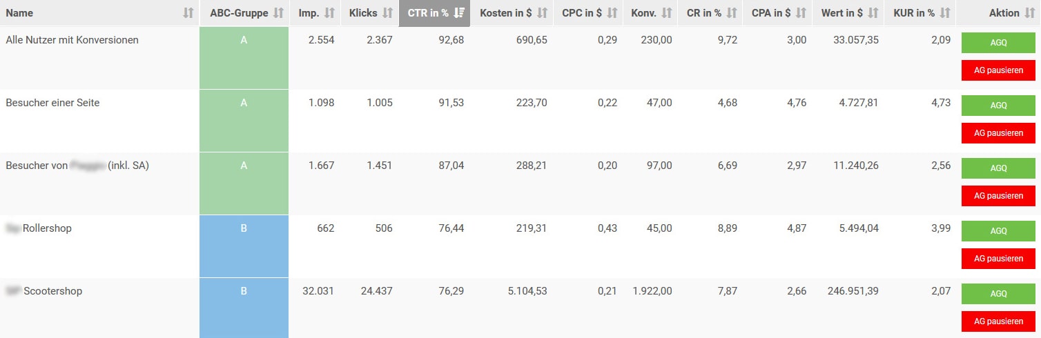 In der Ebene der Anzeigengruppen finden Sie, wie auch bei den Kampagnen eine tabellarische Übersicht mit den KPIs aller Anzeigengruppen. Auch die Anzeigengruppen werden nach der CTR sortiert und in die ABC-Klassen eingeordnet. Wurde auf der höheren Ebene eine Kampagne markiert, werden hier alle Anzeigengruppen der Kampagne ebenfalls blau markiert angezeigt. Selbstverständlich können Sie aber auch auf dieser Ebene eine Auswahl treffen.